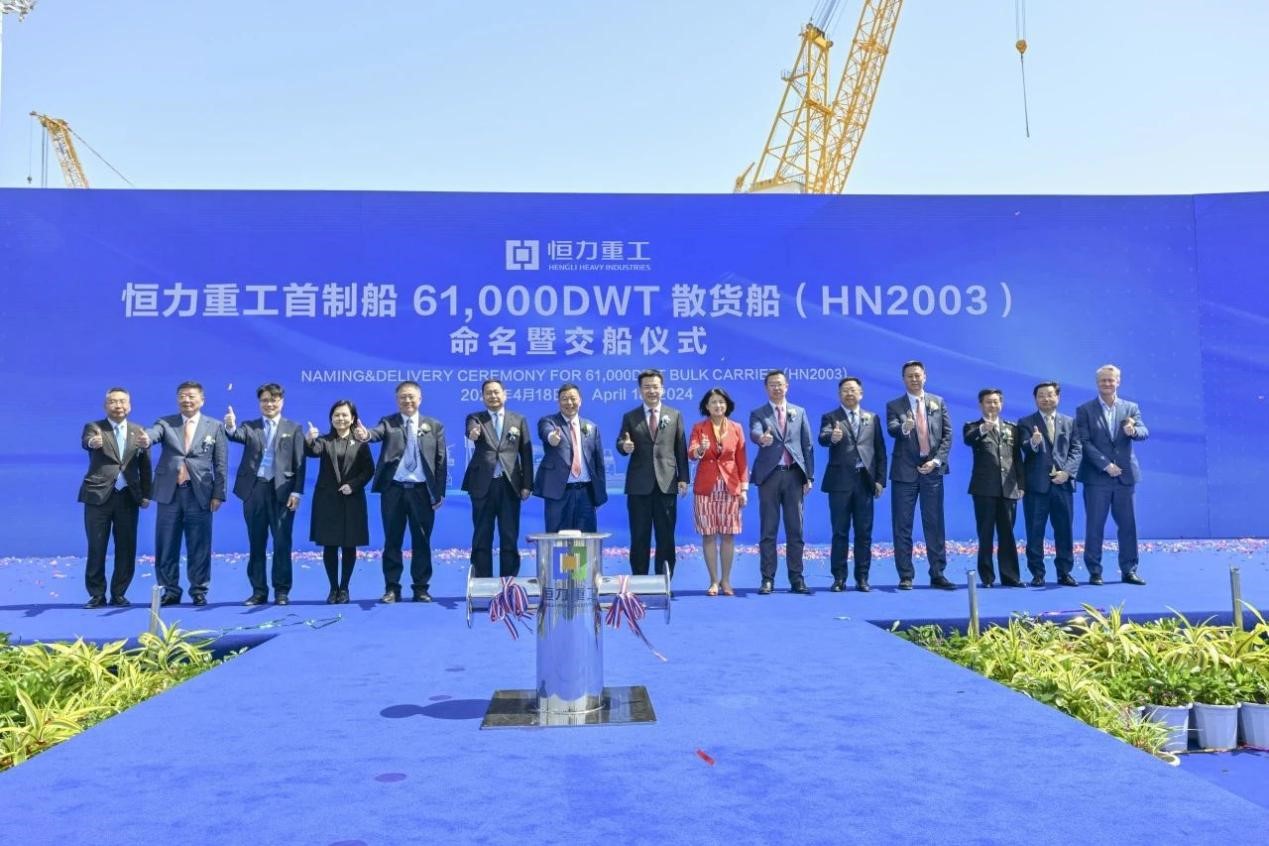 2024-04-224月18日,信達金租在恒力重工下單建造的61000噸散貨船(HN2003)提前順利交付,信達金租總經理張東輝出席交船儀式并致辭,大連市委常委、市政府副市長劉恩舉,恒力集團董事長陳建華、中國